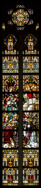 Op het raam zijn veel personen afgebeeld. De belangrijkste is de verrezen Christus, rechtsboven. Hij is voorgesteld als koning met een kroon op zijn hoofd en zittend op een troon. Op zijn rechterhand en linkervoet zijn de littekens te zien van de kruisiging. Het geopende boek in zijn linkerhand toont de alfa en de omega, de eerste en laatste letter van het Griekse alfabet.