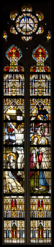 In het rozetraam bovenin bevindt zich een afbeelding van een pelikaan op het nest die zichzelf verwondt om met bloed haar jongen te voeden. De pelikaan staat in het christendom symbool voor Jezus' zelfopoffering: zijn bloed vloeide tot heil van de mens.